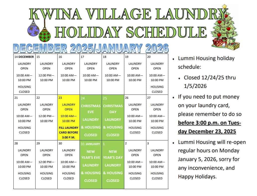 - Lummi Housing will re-open regular hours on Monday January 5, 2026, sorry for any inconvenience, and Happy Holidays.